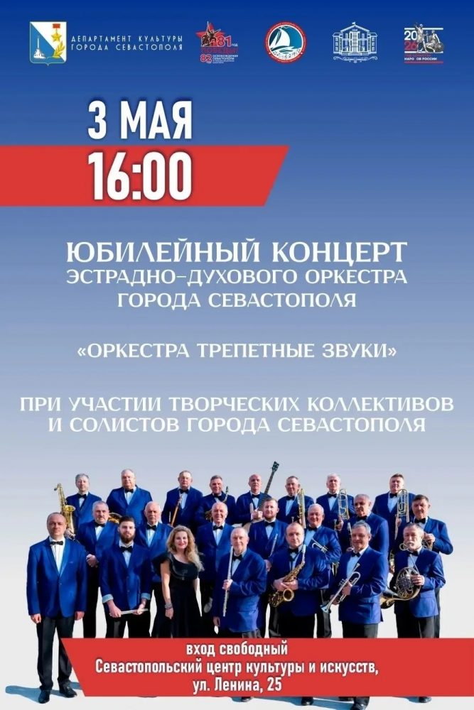 Приглашаем 3 мая в 16:00 в Севастопольский центр культуры и искусств на праздничный концерт, посвящённый пятилетию Эстрадно‑духового оркестра города Севастополя.