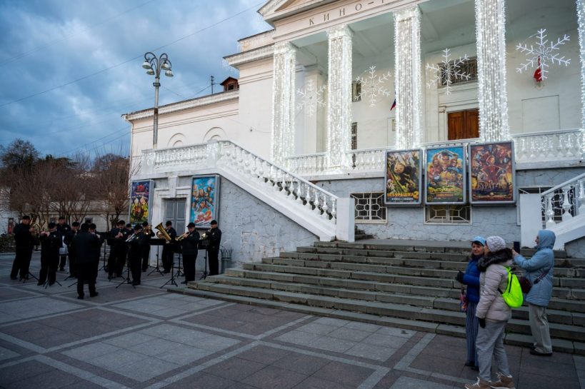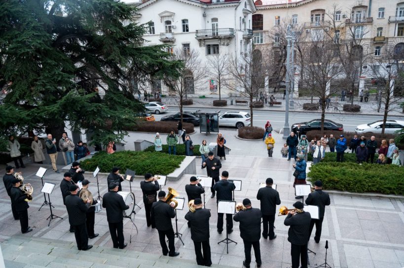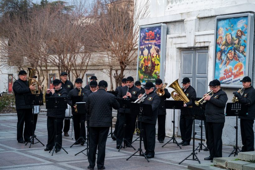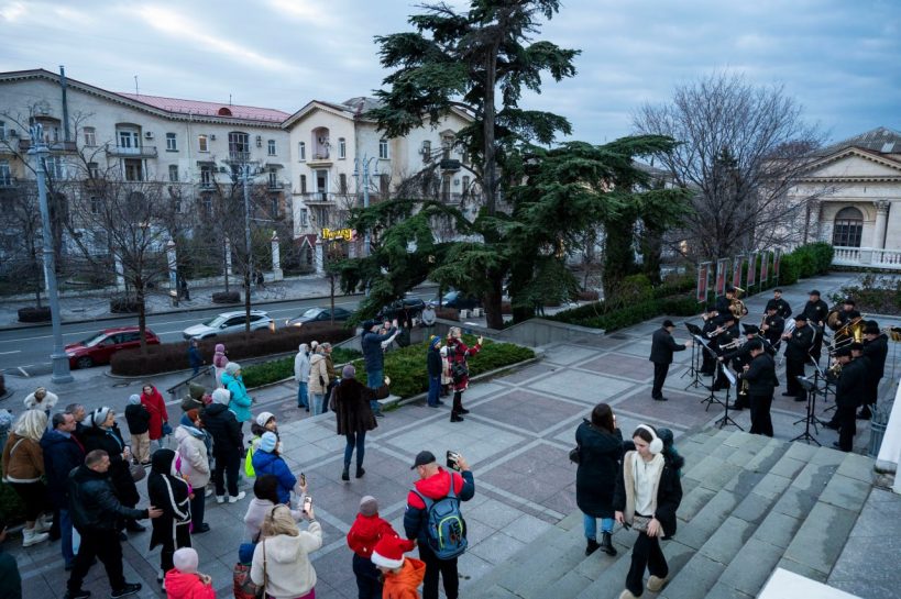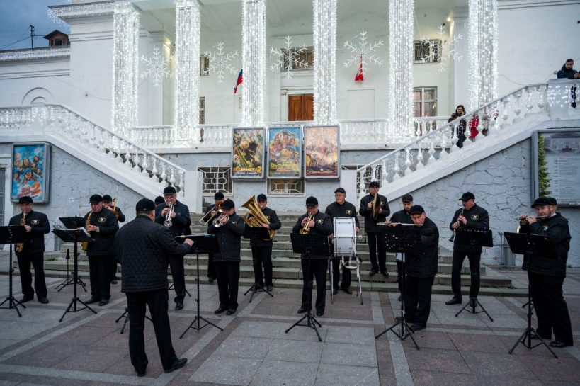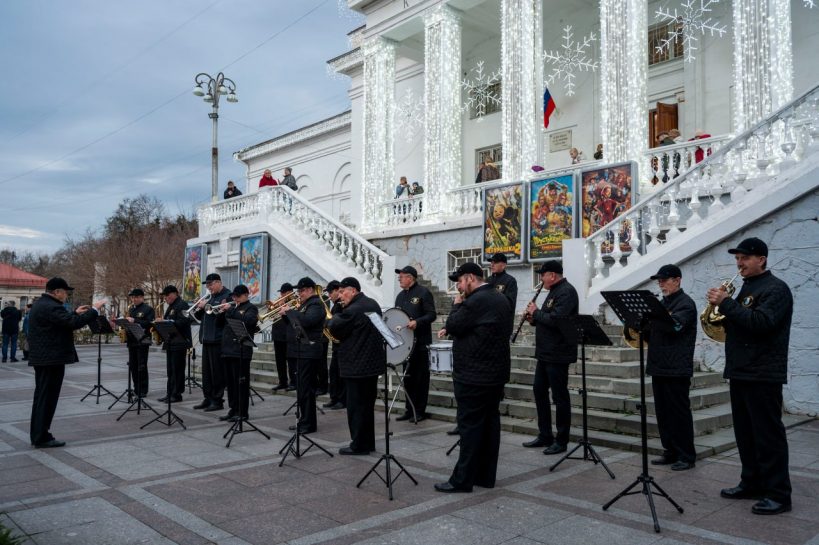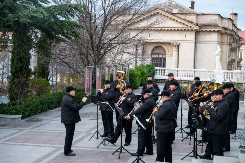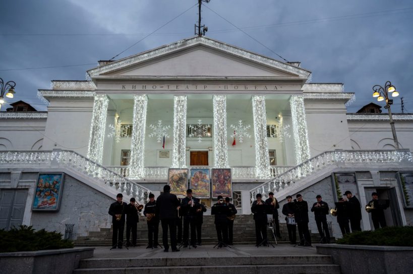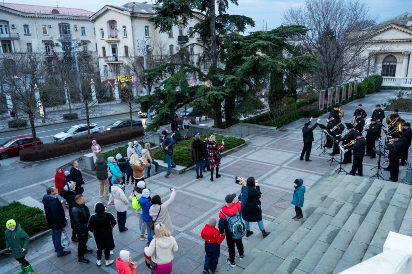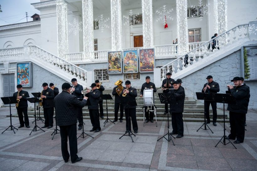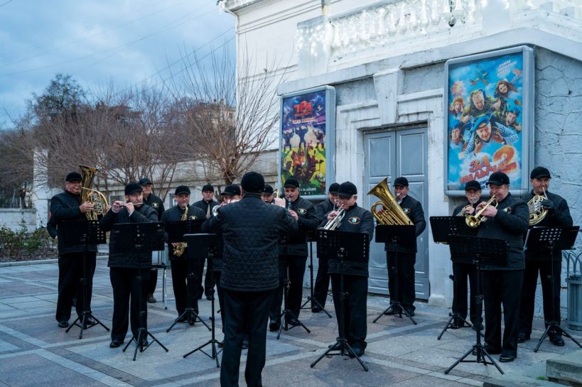 С 3 по 7 января в рамках новогодних и рождественских каникул у кинотеатра «Победа» прошли выступления эстрадно-духового оркестра города Севастополя.