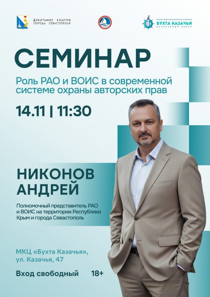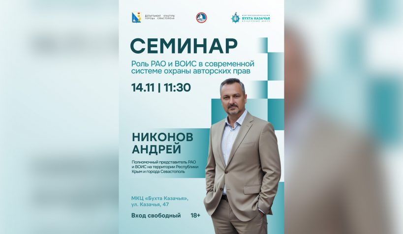 14 ноября в 11:30 в Многофункциональном культурном центре «Бухта Казачья» пройдёт семинар «Роль РАО и ВОИС в современной системе охраны авторских прав».